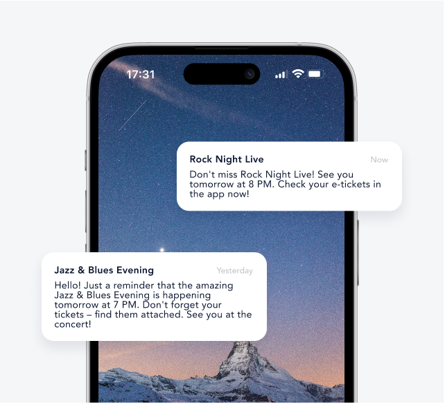 Denne reminder kan sendes på et specifikt tidspunkt op til eventet som I bestemmer (ex 12, 24, 48 timer), og intuitivt inkludere link til kundens billet(ter) som kan fremvises ved ankomst.