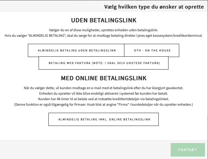 Bruges når der skal oprettes gavekort og kunden ønsker betaling via faktura. I skal udstede og sende faktura.