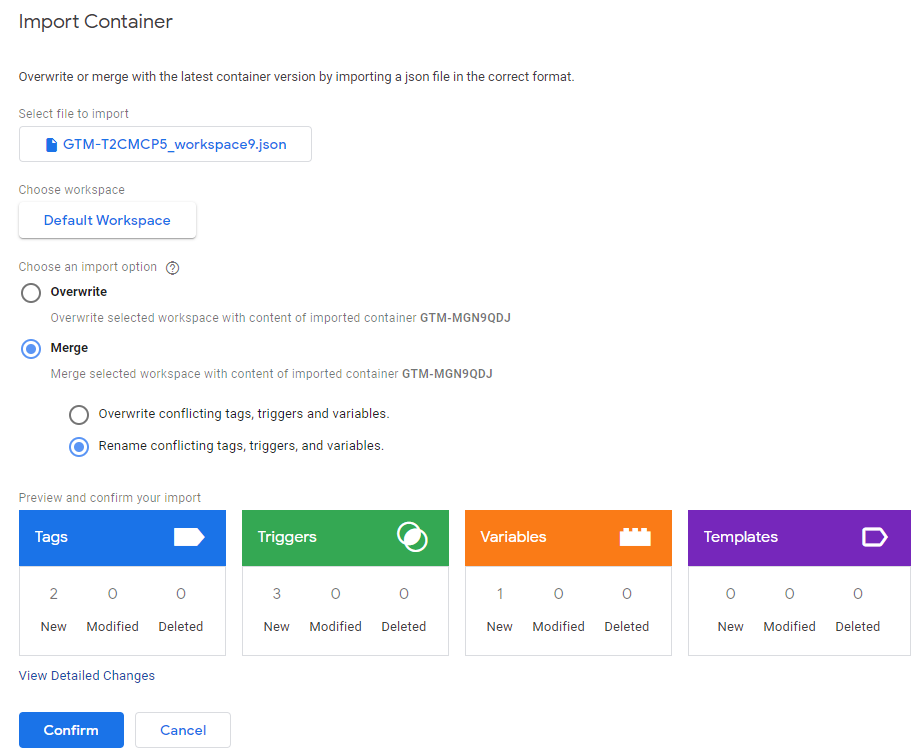 3. Importer ‘lifepeaks ecommerce tracking.json’ filen og vælg ‘existing’ workspace, ‘merge’ and ‘rename’ som vist.Duplikater af triggers og variabler kan eventuelt fjernes efterfølgende.