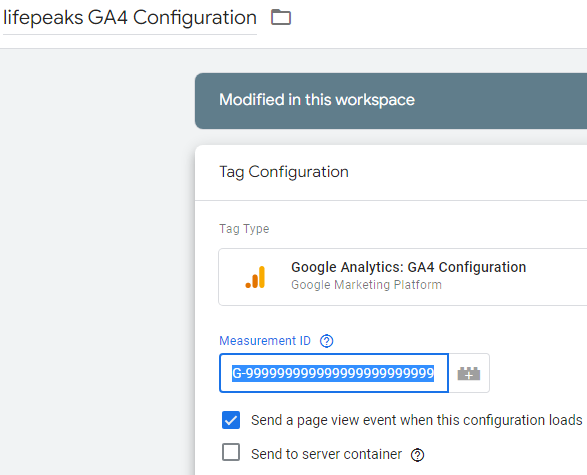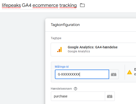 I tags ‘lifepeaks GA4 Configuration’ og ‘lifepeaks GA4 ecommerce tracking’ opdater trackign ID med jeres GA4 tracking ID.