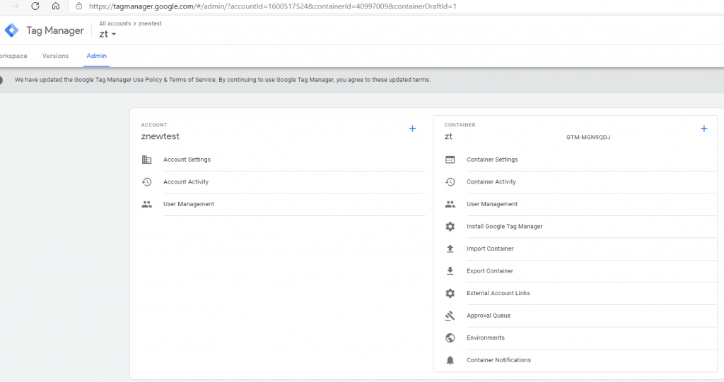 2. Gå til Admin sektionen af Tag Manager og klik ‘Import Container’