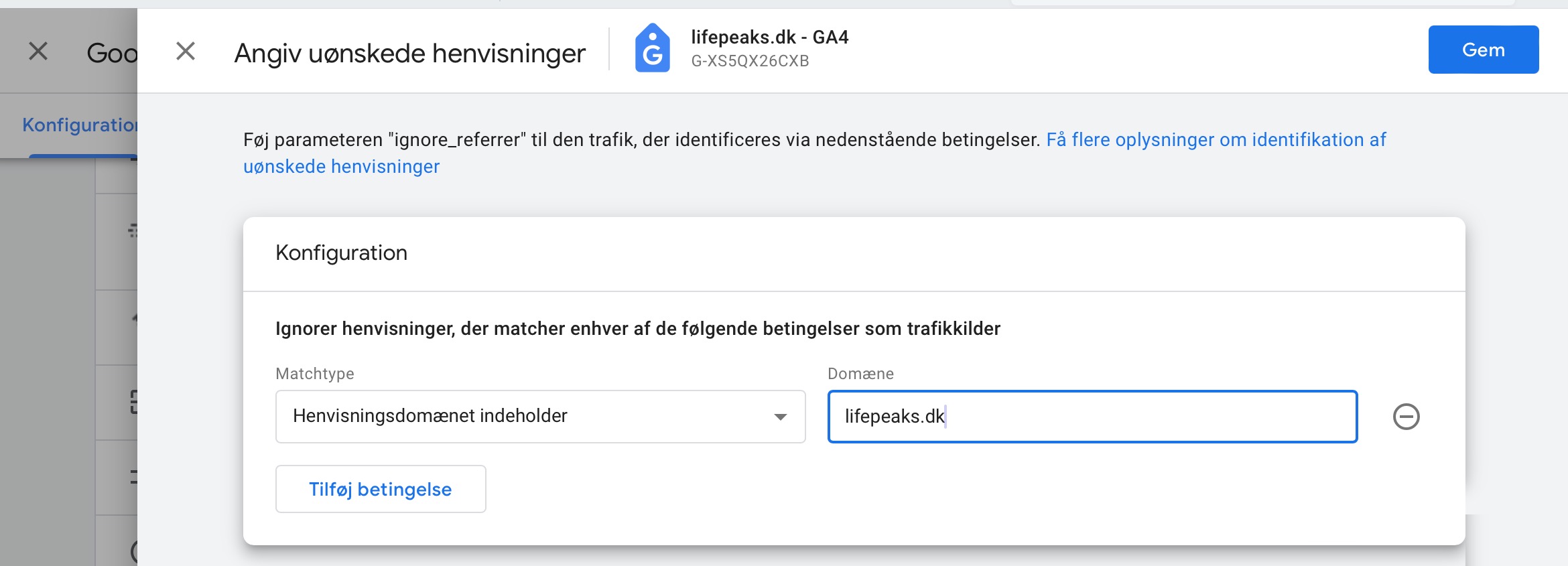 Derudover så skal I for GA4 oprette lifepeaks.dk som uønsket henvisning under Google analytics admin (møtrik nederst til venstre på første billede nedenfor) -> datastrømme -> klik der på den eksisterende datastrøm og derinde vælg Konfigurer som vist på første billede.