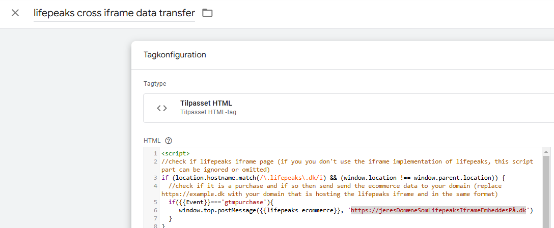 Hvis man vil køre med to containere, er det også muligt. I det tilfælde skal man efter nedenstående punkt 2 beskrevne import, ’blot’ hive ‘iframe host domain’ kode delen ud af ‘lifepeaks iframe’ tagget og lægge denne i den anden tag manager container i et custom HTML tag, med en tag manager trigger på de sider hvor lifepeaks iframe indlæses eller bare en all pages trigger hvis man er i tvivl, samt et ga4 event tag identisk med det importerede.